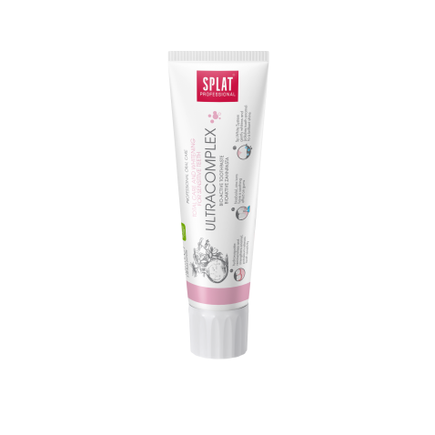 SPLAT® PROFESSIONAL ULTRACOMPLEX® gently whitens sensitive teeth, maintains gum health and provides exceptionally fresh breath. Innovative Sp.White System polishes the enamel to a brilliant shine and promotes oral care health - natural papaya enzyme (Papain) and rounded polishing particles of silica help to remove surface stains and dental plaque, Polydon (PVP)- film-forming component, covers teeth with a protective film, effectively contributing to long-term cleansing. Hydroxyapatite helps to reduce hypersensitivity, active Calcium strengthens the enamel. Potassium ions (Potassium Nitrate) also relieve tooth sensitivity while Zinc ions (Zinc Citrate) protect against tooth decay and freshens breath.